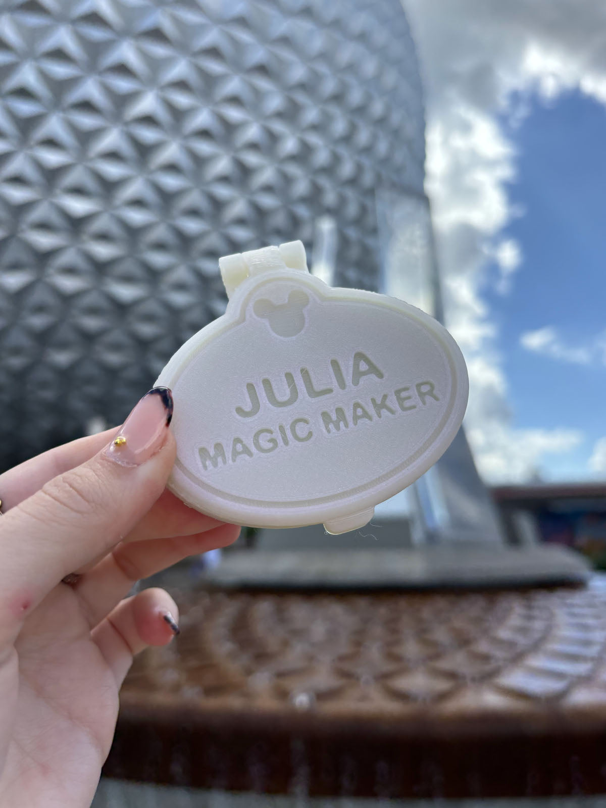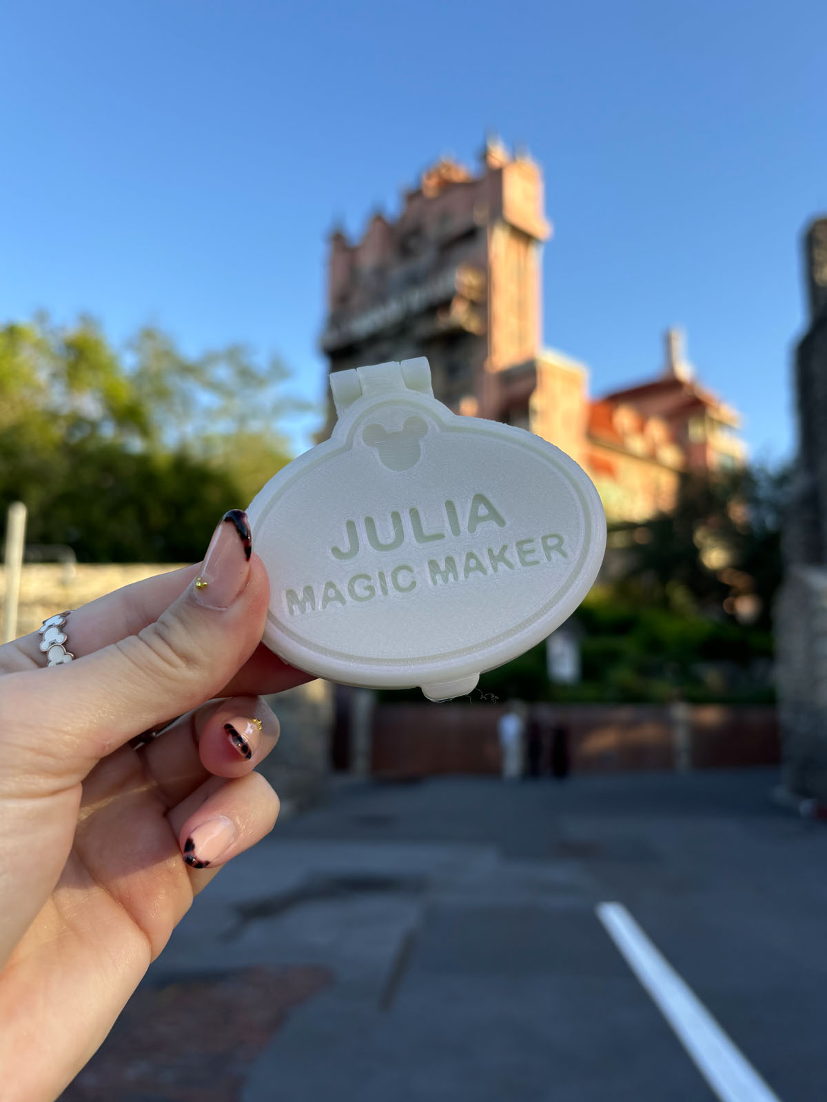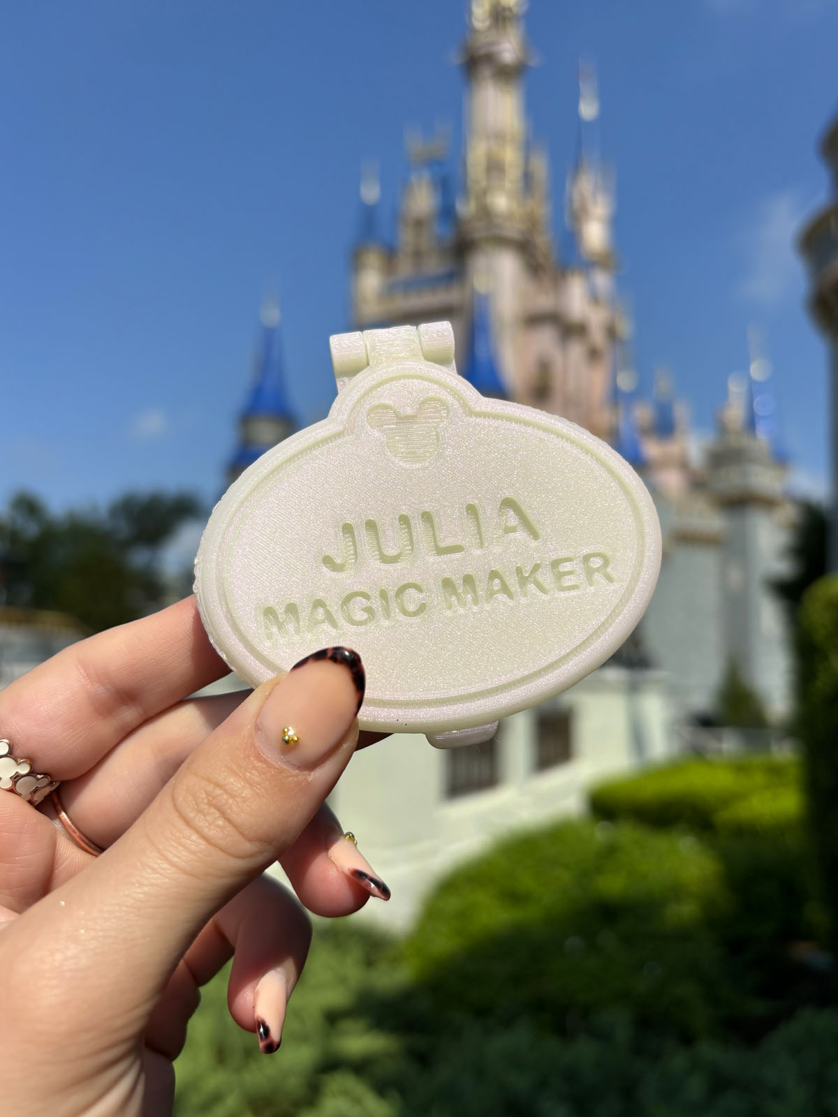 Always have a magical reflection handy in your bag or pocket with our Cast Member Compact Mirror! Complete with two real glass mirrors and printed in iridescent pearl and customized with your name.