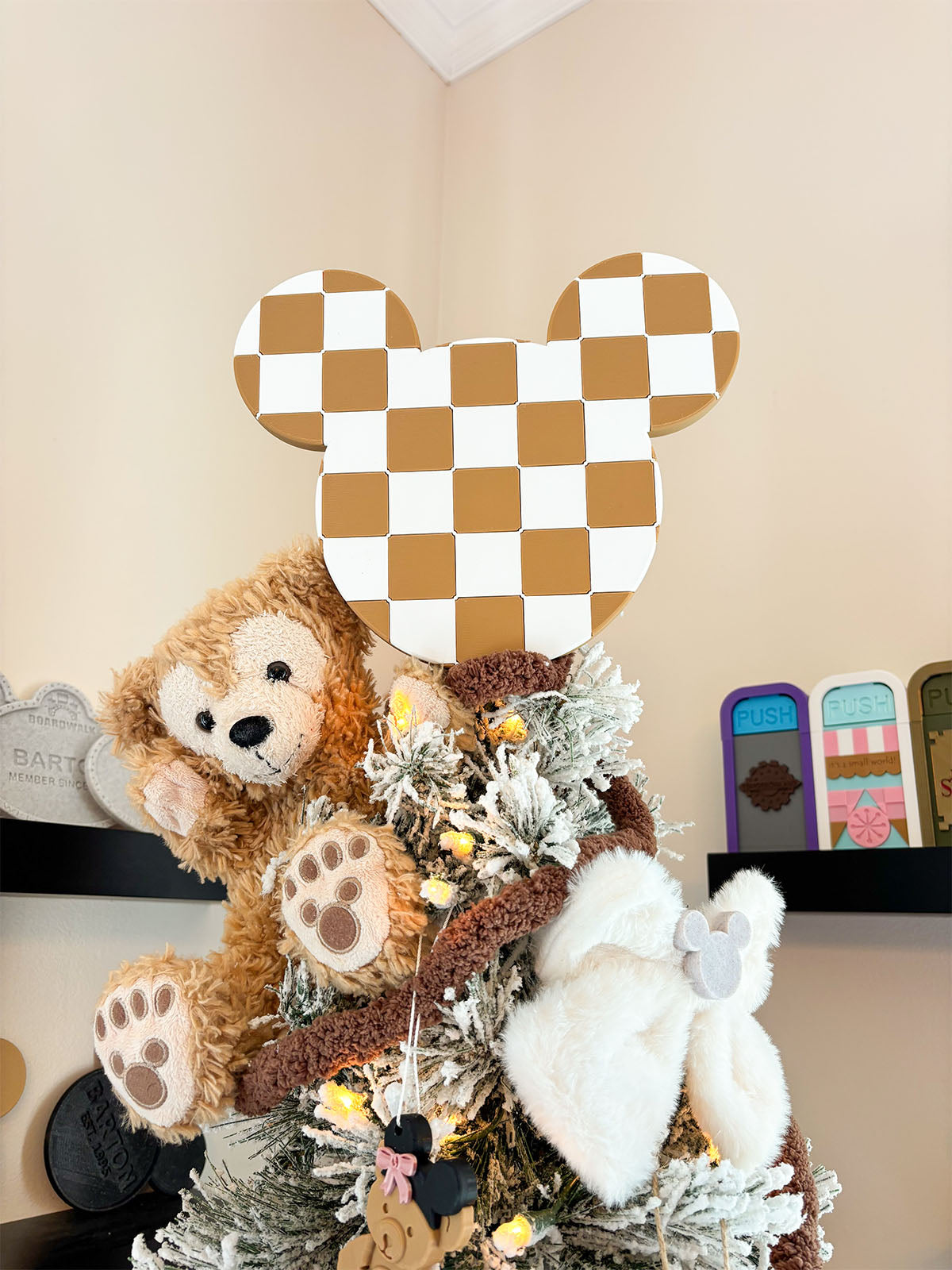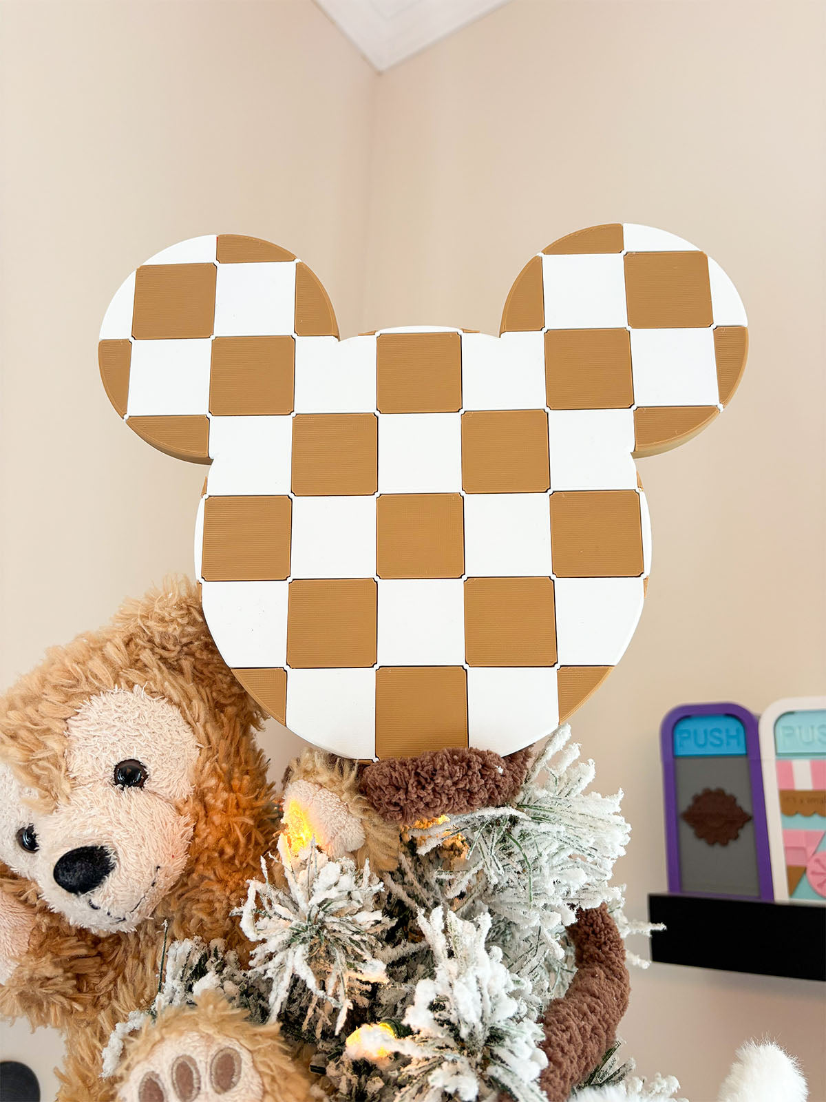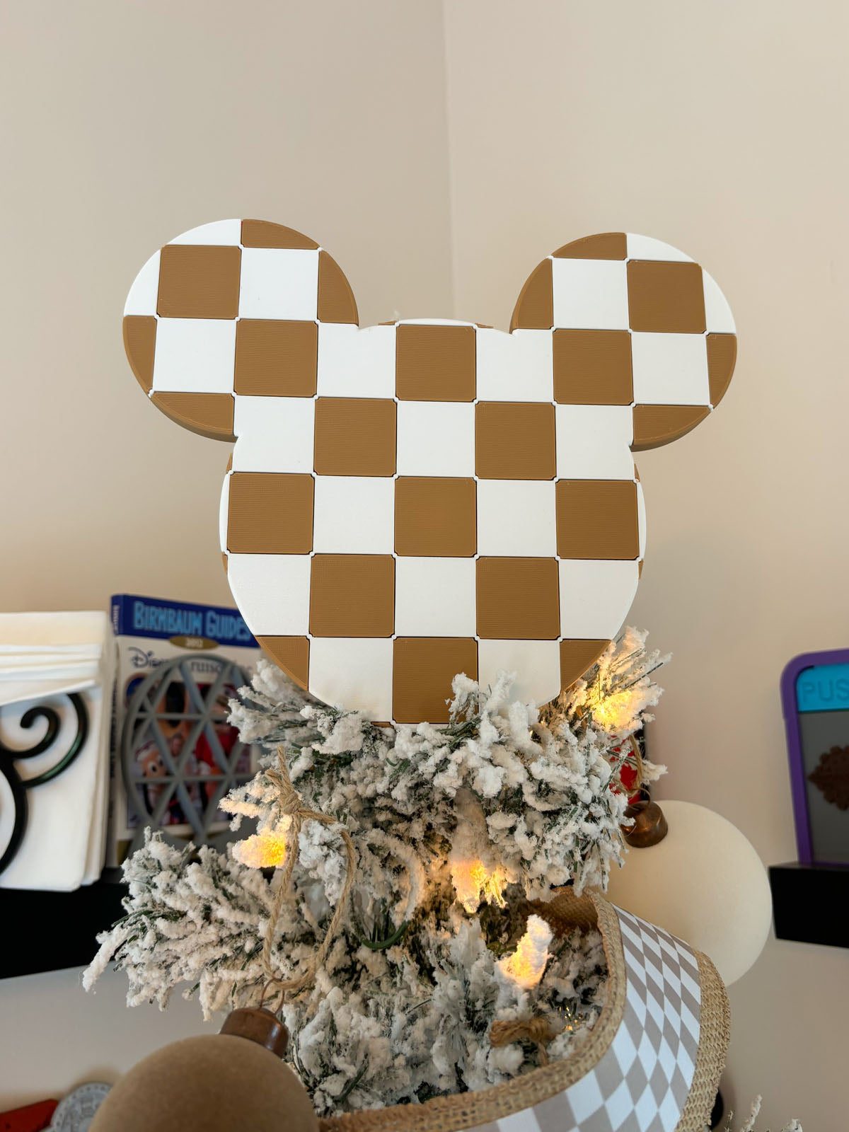 Give any tree the stylish Disney vibe this holiday season with our neutral Checkered Mouse Head Christmas Tree Topper!
