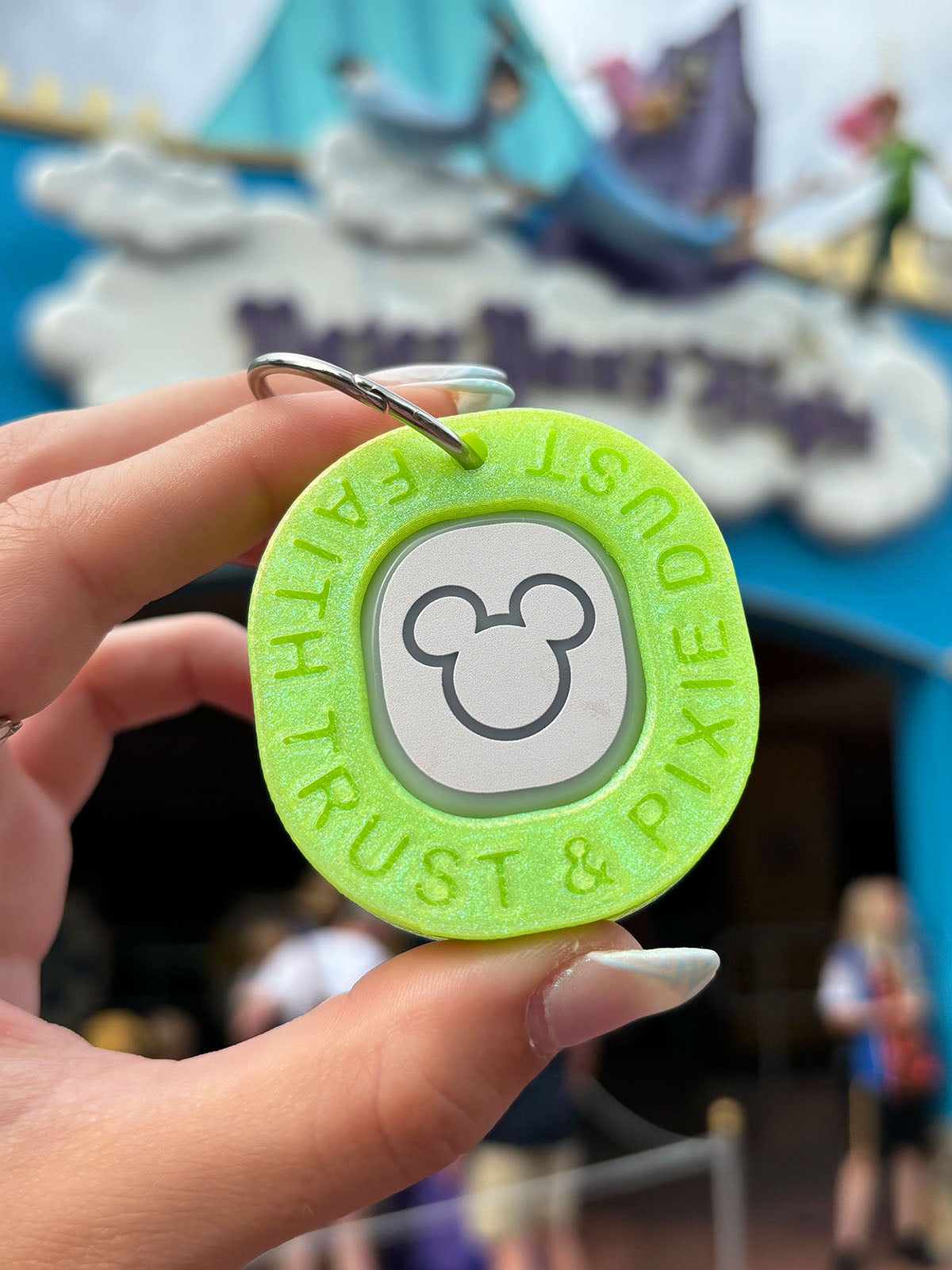 Simply install your Disney MagicBand+ Icon center "puck" into this custom Magic Band Buddy and clip on to belt, clothes, pin lanyard, bag, etc. It will provide easy access to parks, Lightning Lane access, payment kiosks, your resort room, and more while showing off your unique style. Collect them all to coordinate with your outfit, your agenda, or your attitude!