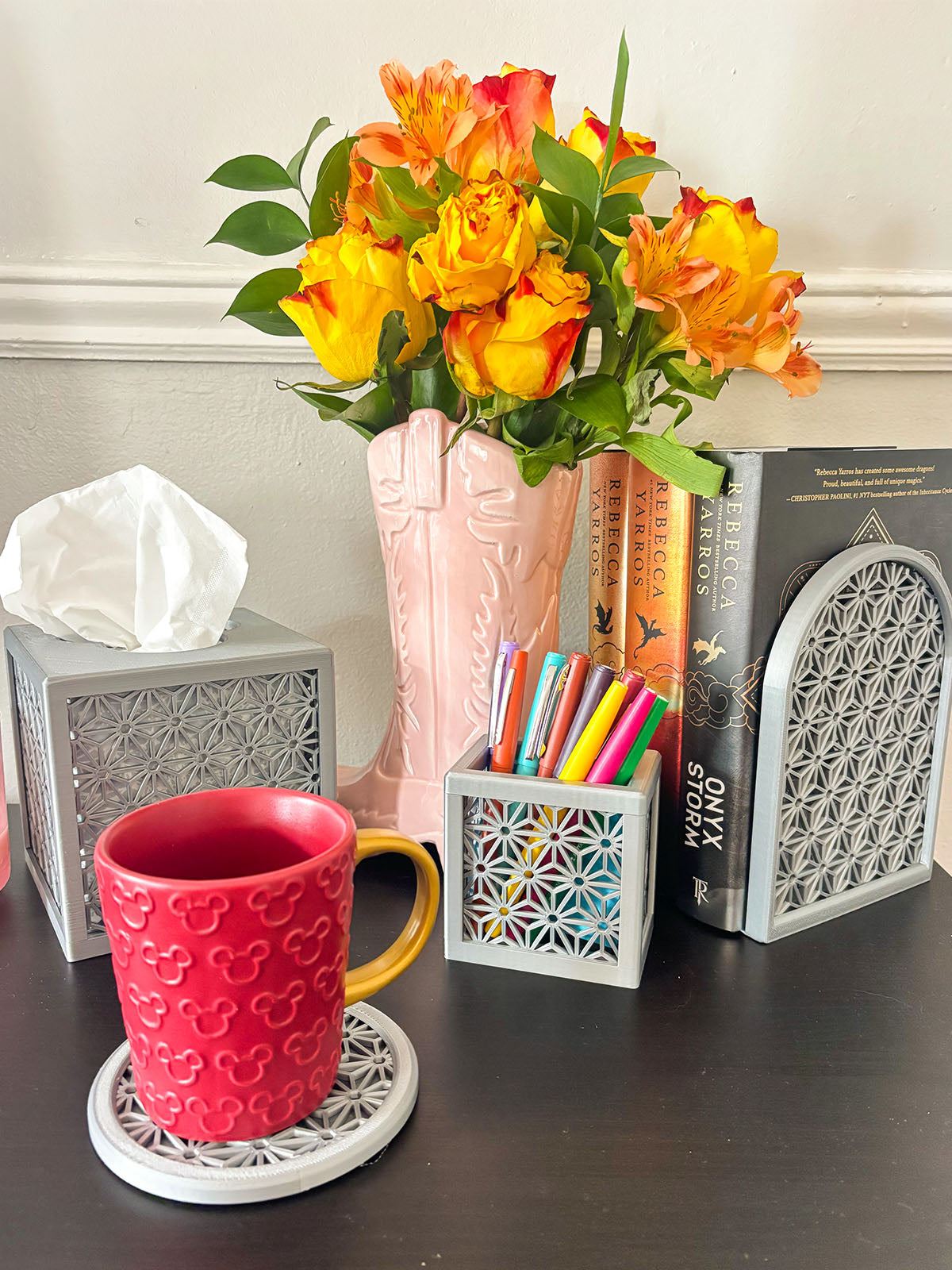 Our home/desk décor items are designed and made by 3D printing in the USA using plant based, environmentally friendly PLA (PolyLactic Acid) plastics. Colors depicted in photos may vary from actual items due to lighting and plastic filament manufacturer slight color variations.