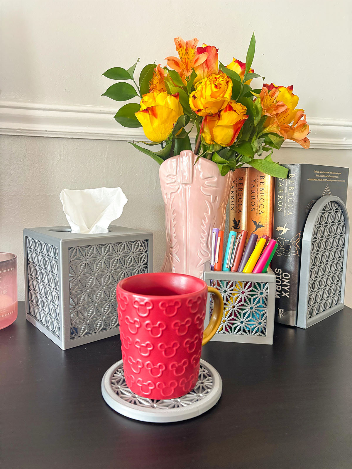 Our home/desk décor items are designed and made by 3D printing in the USA using plant based, environmentally friendly PLA (PolyLactic Acid) plastics. Colors depicted in photos may vary from actual items due to lighting and plastic filament manufacturer slight color variations.