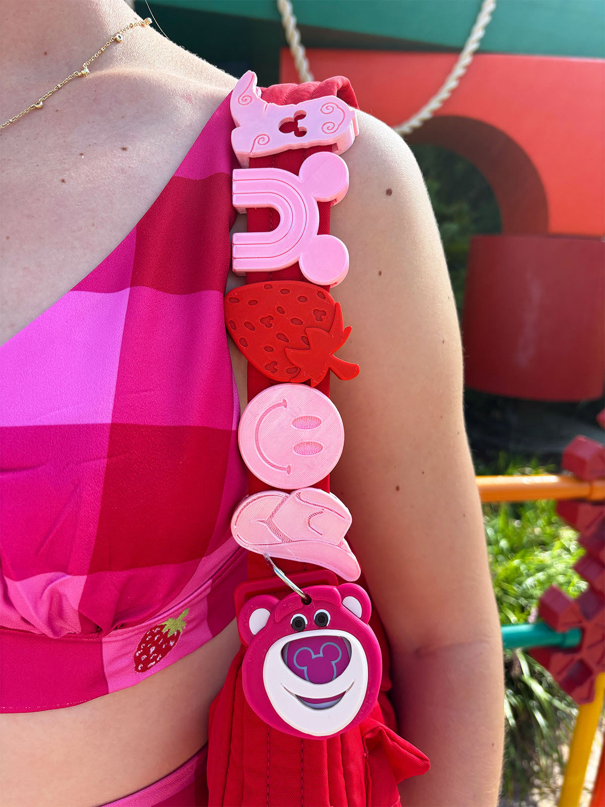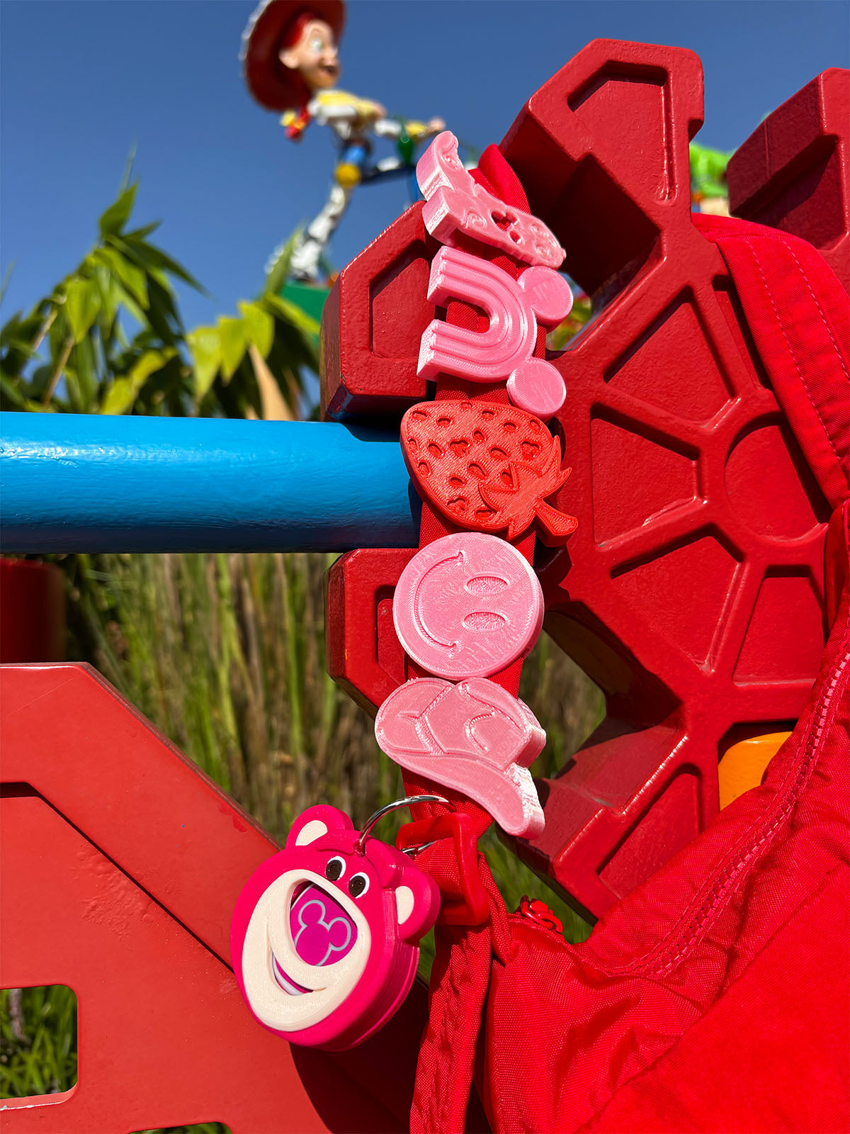 We recommend a Lock Adapter for narrower straps or lanyards less than 1.5" wide. Listing is for one tree charm in green color filament. Other items pictured are not included, but other Bag Charms and Magic Band Buddies are available separately.
