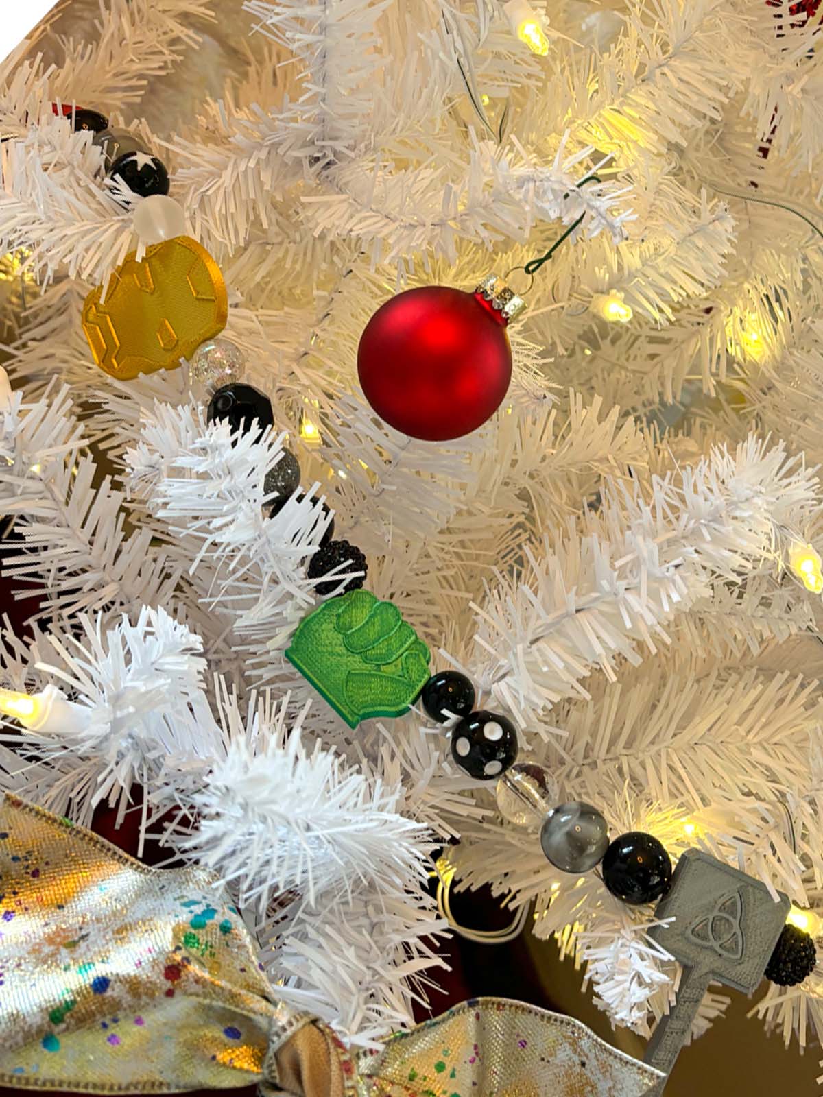 Each garland comes in approximately 5' strands of 2 each hero character 3D printed icons (12 total) with bubble gum beads in between. Icons are printed in premium silk filament and include blue star shield, gold iron face, silver hammer, red hourglass, purple bow, & green fist. Each icon is approximately 1.5" wide x 1.5"-2.5" tall x .25" thick (38mm x 38-64mm x 6mm)